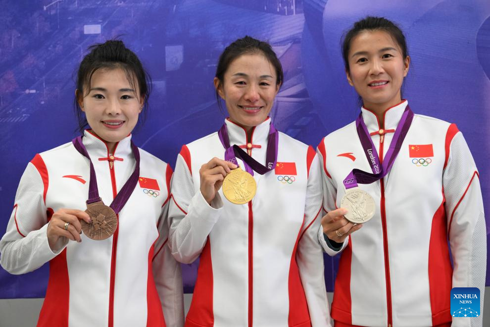 Gold medalist Qieyang Shijie (C), silver medalist Liu Hong (R) and bronze medalist Lyu Xiuzhi of China for the Women's 20km Race Walk at the 2012 London Olympic Games pose for photos after the Olympic Medal Reallocation Ceremony in Hangzhou, east China's Zhejiang Province, Oct. 4, 2023. (Xinhua/Jiang Wenyao)