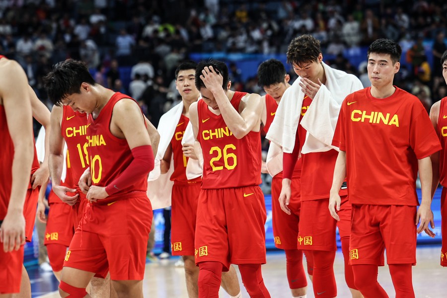 Chinese players leave the court after losing to the Philippines in the men's basketball semifinal at the Hangzhou Asian Games on Oct. 4, 2023. (Xinhua/Pan Yulong)
