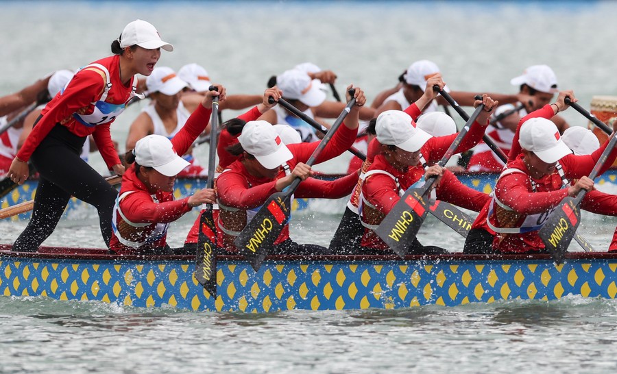 Team China competes in the women's 1,000m dragon boat final. (Xinhua/Meng Chenguang)