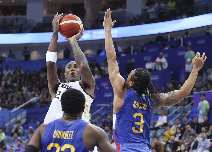 Players compete during the men's basketball final between Jordan and the Philippines. (Xinhua/Pan Yulong)