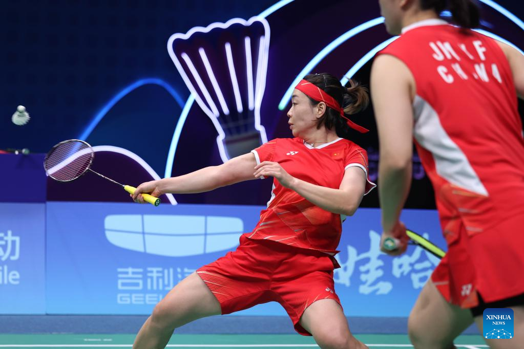 Chen Qingchen (R)/Jia Yifan of China compete during the Women's Doubles Semifinal of Badminton between Chen Qingchen/Jia Yifan of China and Kim Soyeong/Kong Heeyong of South Korea at the 19th Asian Games in Hangzhou, east China's Zhejiang Province, Oct. 6, 2023. (Xinhua/Chen Bin)