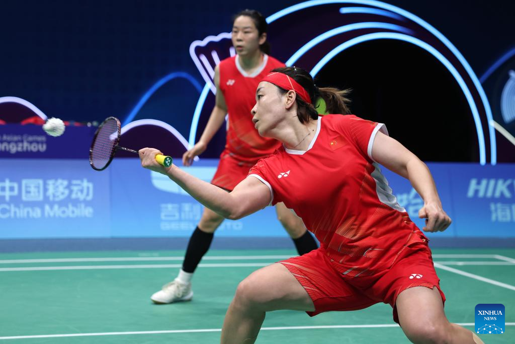 Chen Qingchen (R)/Jia Yifan of China compete during the Women's Doubles Semifinal of Badminton between Chen Qingchen /Jia Yifan of China and Kim Soyeong/Kong Heeyong of South Korea at the 19th Asian Games in Hangzhou, east China's Zhejiang Province, Oct. 6, 2023. (Xinhua/Chen Bin)