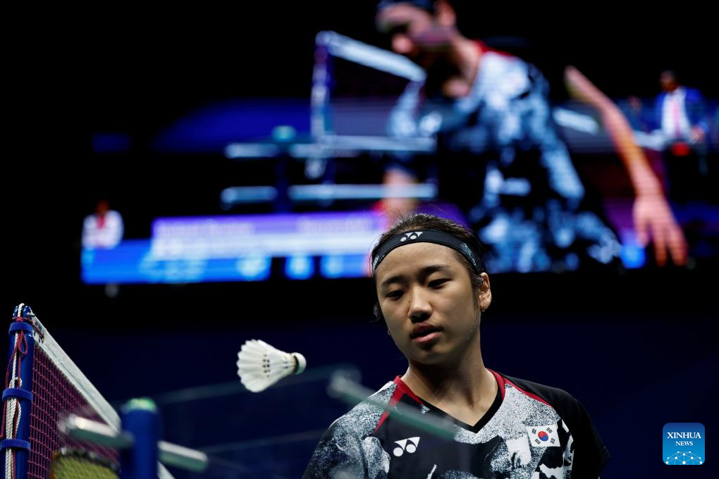 An Seyoung of South Korea competes against He Bingjiao of China during the Women's Singles Semifinal of Badminton at the 19th Asian Games in Hangzhou, east China's Zhejiang Province, Oct. 6, 2023. (Xinhua/Ren Zhenglai)