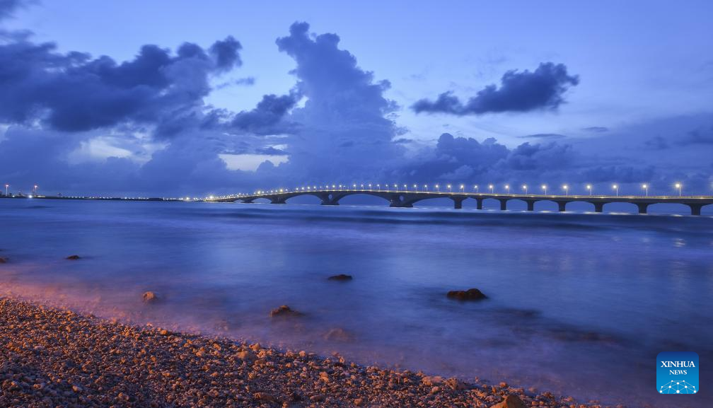 This photo taken on Aug. 31, 2019 shows the illuminated China-Maldives Friendship Bridge in Maldives. Built with support from China, the opening of the bridge meant that for the first time, people could walk from capital Male to the neighboring island of Hulhumale. (Photo by Du Cailiang/Xinhua)