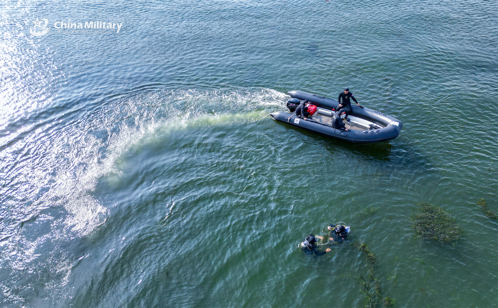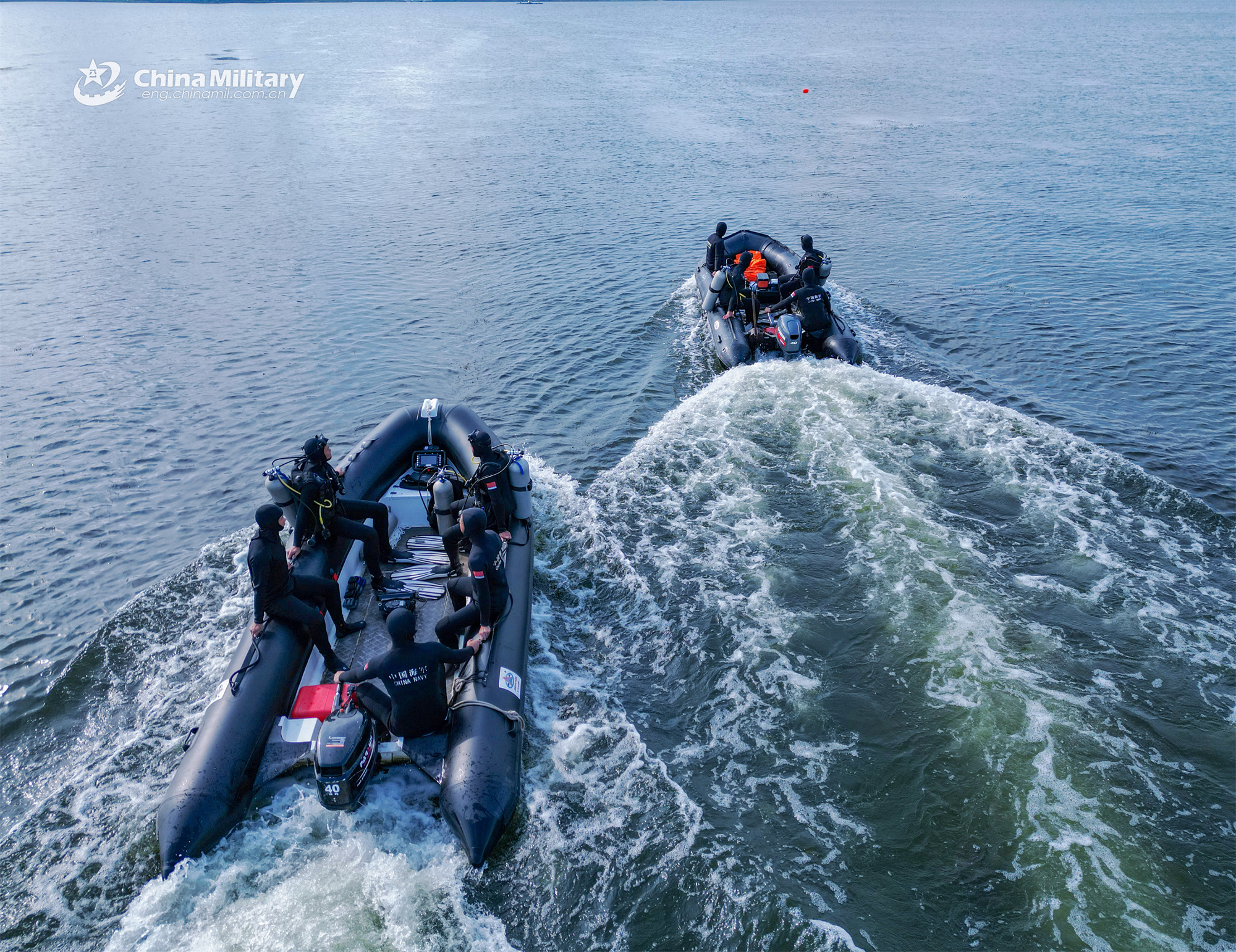 Frogmen assigned to a mine countermeasures (MCM) detachment of the navy under the PLA Eastern Theater Command manipulate their combat rubber raiding crafts (CRRC) to the designated waters during an explosive ordnance disposal and diving training exercise on September 17, 2023. (eng.chinamil.com.cn/Photo by Guo Qun)