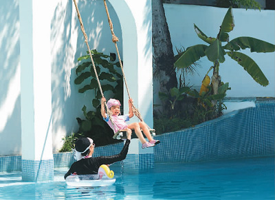 Tourists play in the swimming pool of a B&B hotel in Bohou village. (Xinhua/Liu Yongzhen)