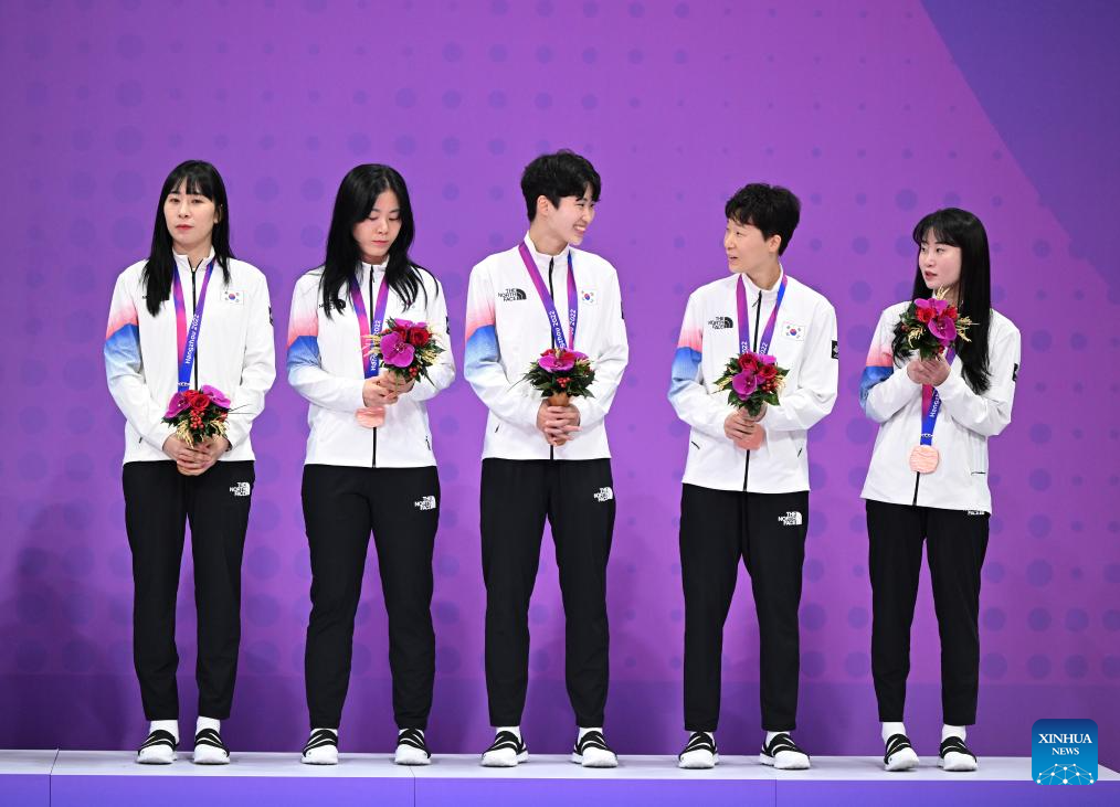 Bronze medalists team South Korea attend the awarding ceremony of the Women's Regu of Sepaktakraw at the 19th Asian Games in Jinhua, east China's Zhejiang Province, Oct. 7, 2023. (Xinhua/Chen Zhonghao)