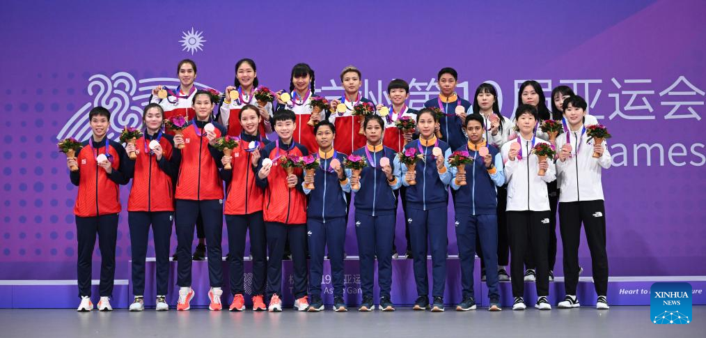Gold medalists team Thailand, silver medalists team Vietnam, bronze medalists team India and team South Korea attend the awarding ceremony of the Women's Regu of Sepaktakraw at the 19th Asian Games in Jinhua, east China's Zhejiang Province, Oct. 7, 2023. (Xinhua/Chen Zhonghao)