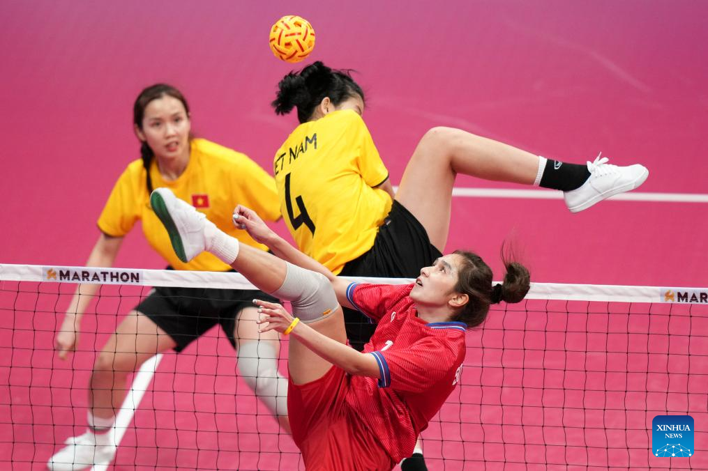 Somruedee Pruepruk (bottom) of Thailand competes during the Women's Regu Gold Medal Match of Sepaktakraw between Thailand and Vietnam at the 19th Asian Games in Jinhua, east China's Zhejiang Province, Oct. 7, 2023. (Xinhua/Chen Zhonghao)