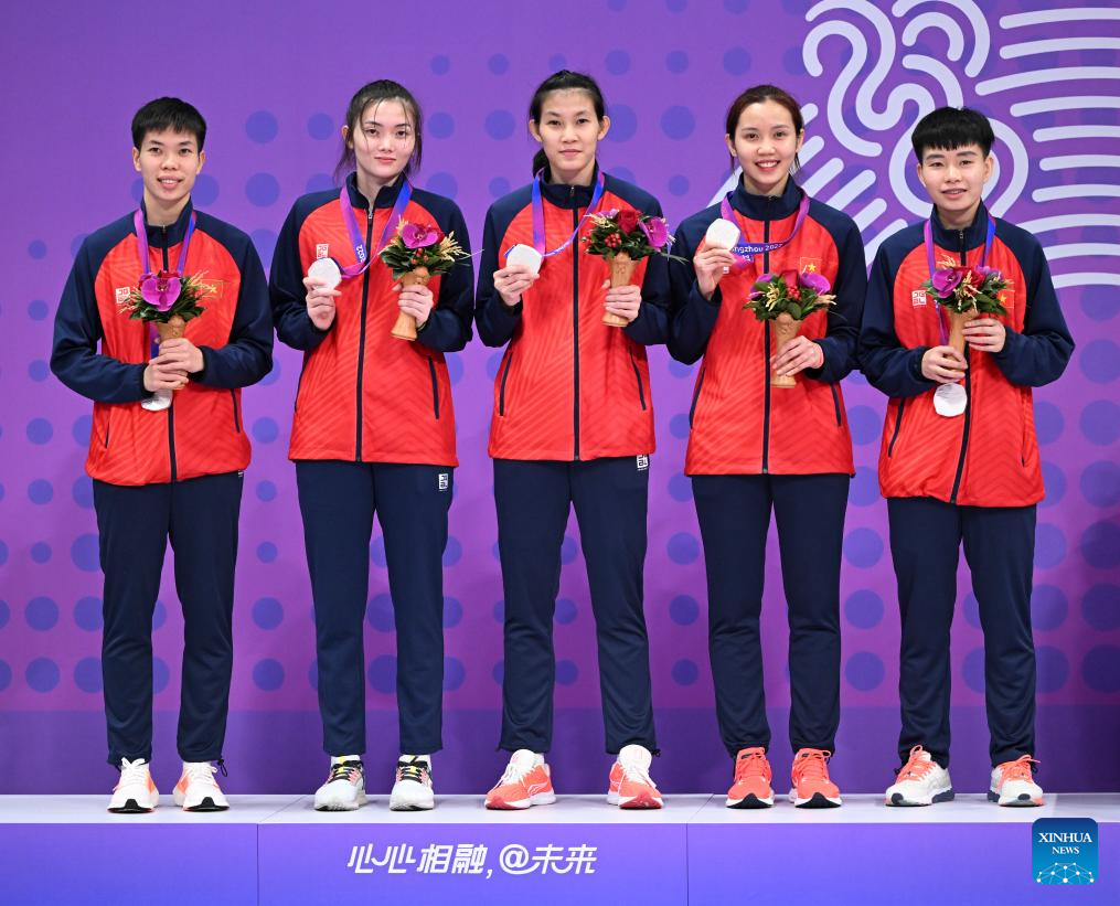 Silver medalists team Vietnam attend the awarding ceremony of the Women's Regu of Sepaktakraw at the 19th Asian Games in Jinhua, east China's Zhejiang Province, Oct. 7, 2023. (Xinhua/Chen Zhonghao)