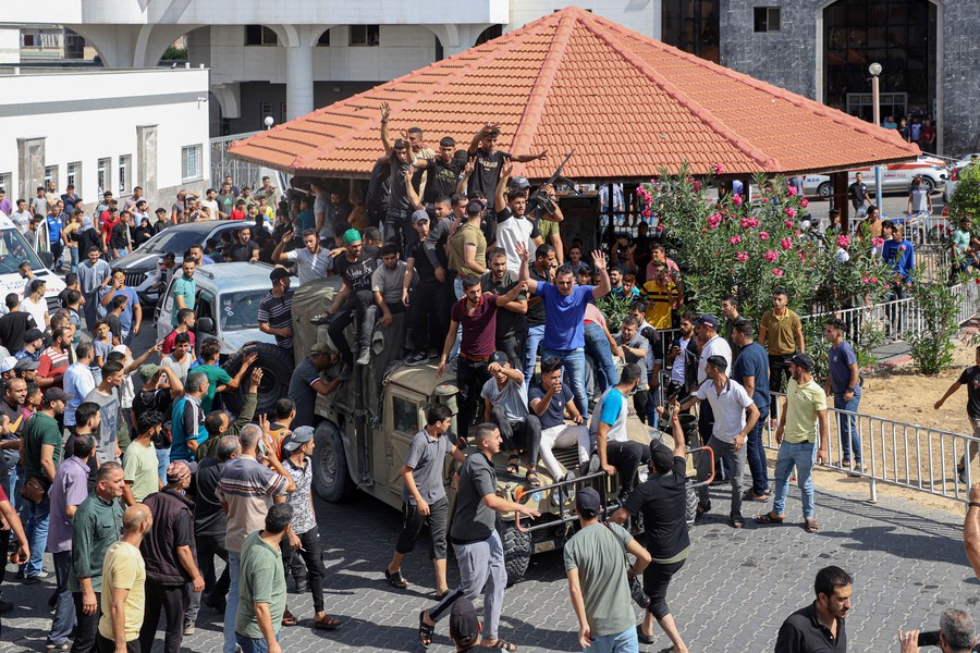Palestinians climb up an Israeli military vehicle in Gaza City, Oct. 7, 2023. (Photo by Rizek Abdeljawad/Xinhua)