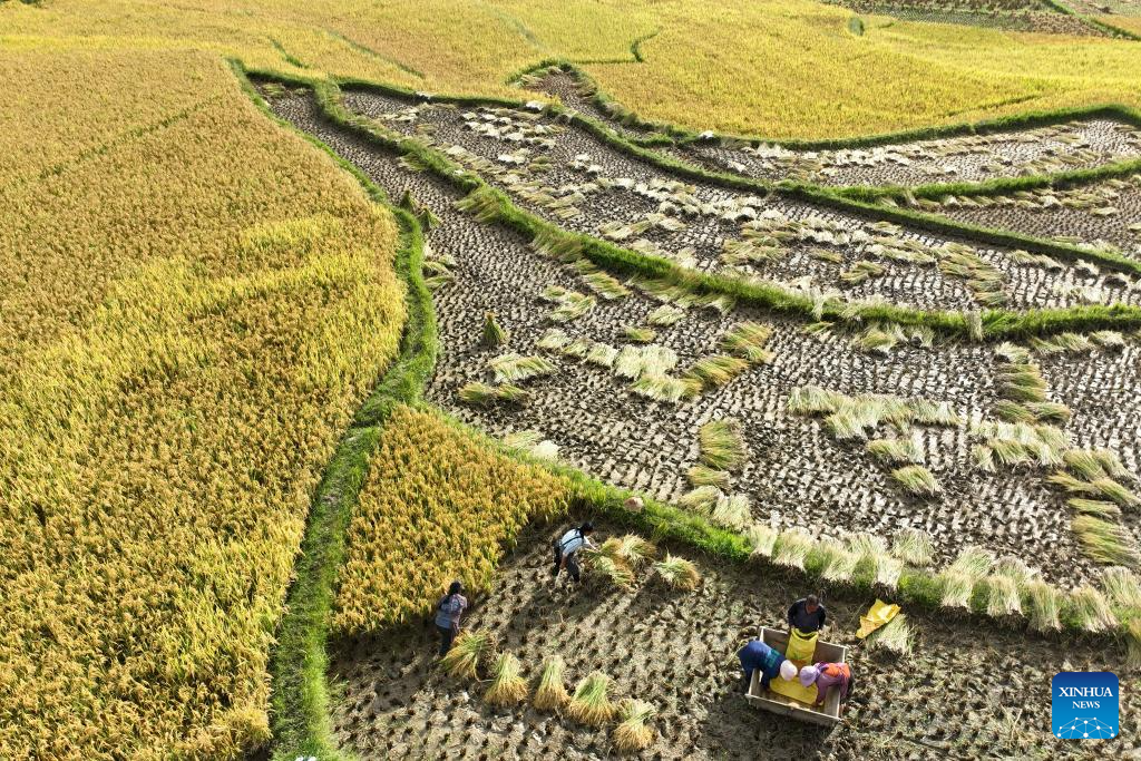 In this aerial photo, farmers harvest glutinous rice in Gangbian Township of Congjiang County, southwest China's Guizhou Province, Oct. 7, 2023. (Photo by Luo Jinglai/Xinhua)