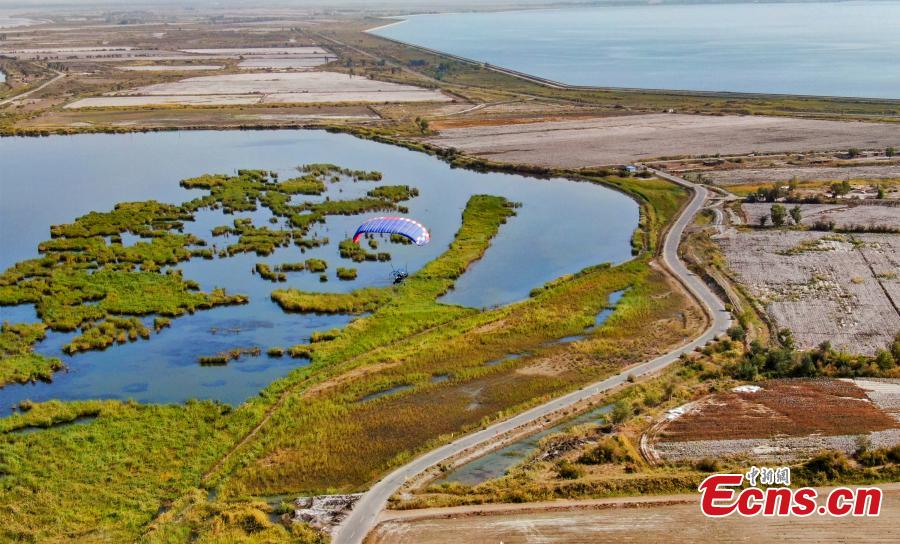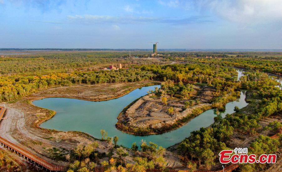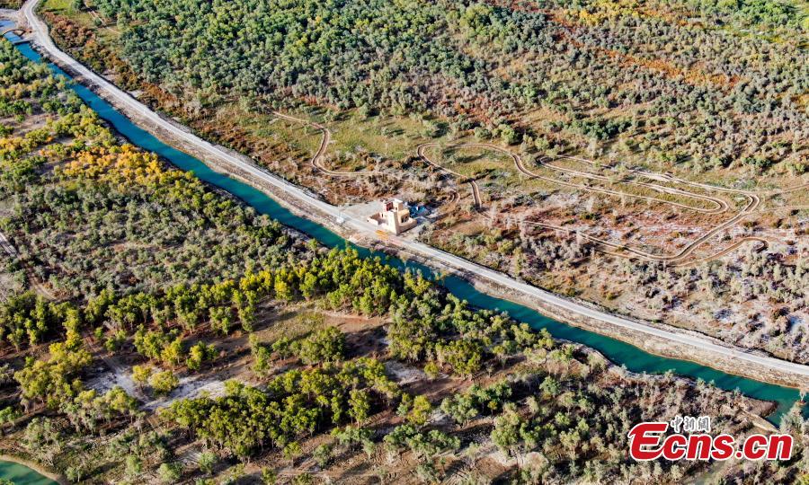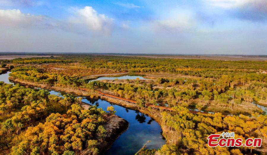 Stunning autumn scenery of desert poplar trees, also known as populus euphratica, along the Tarim River in Xayar County, northwest China's Xinjiang Uygur Autonomous Region. The populus euphratica forest along the Tarim River, China's longest inland river, is the largest natural forest containing this plant species. (Photo: China News Service/Wang Yanshun)