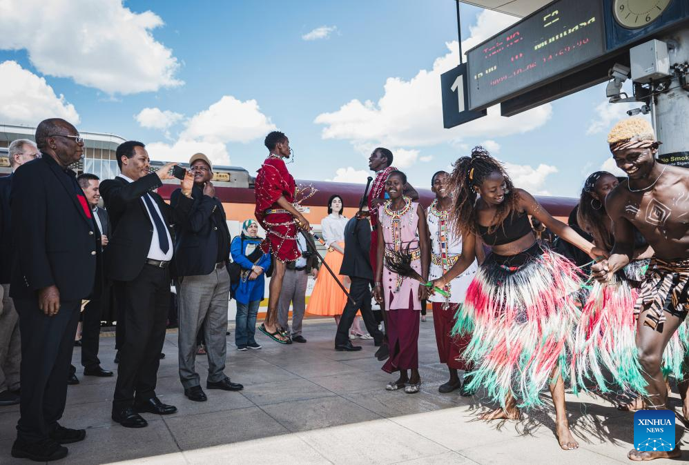 The delegation of envoys watches performance at the Nairobi Station of the Mombasa-Nairobi Railway in Nairobi, Kenya, Oct. 6, 2023. (Xinhua/Wang Guansen)