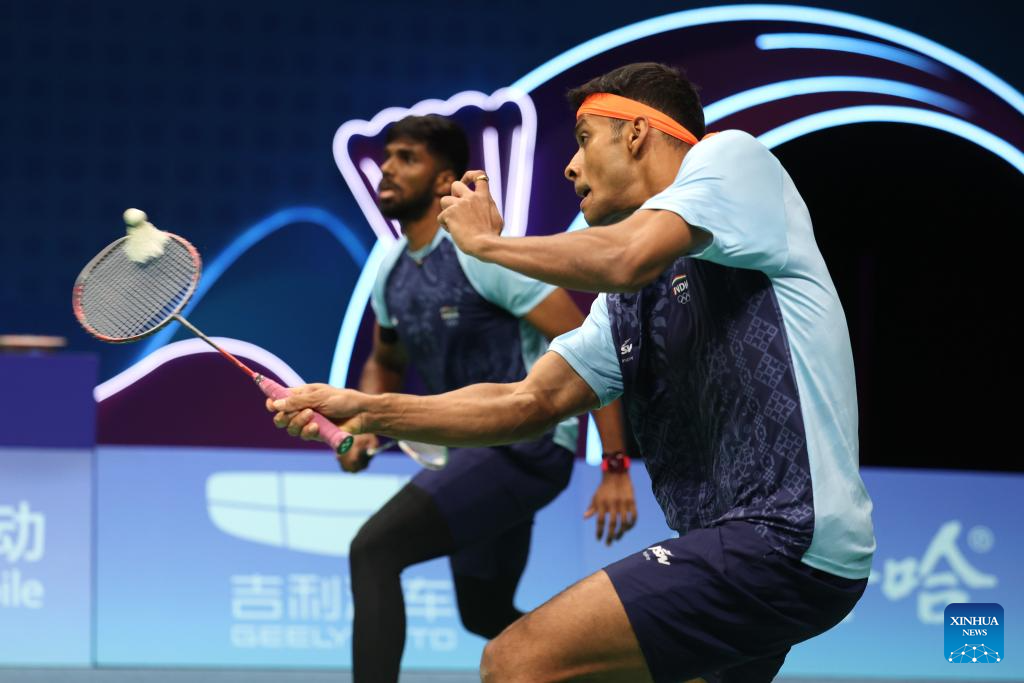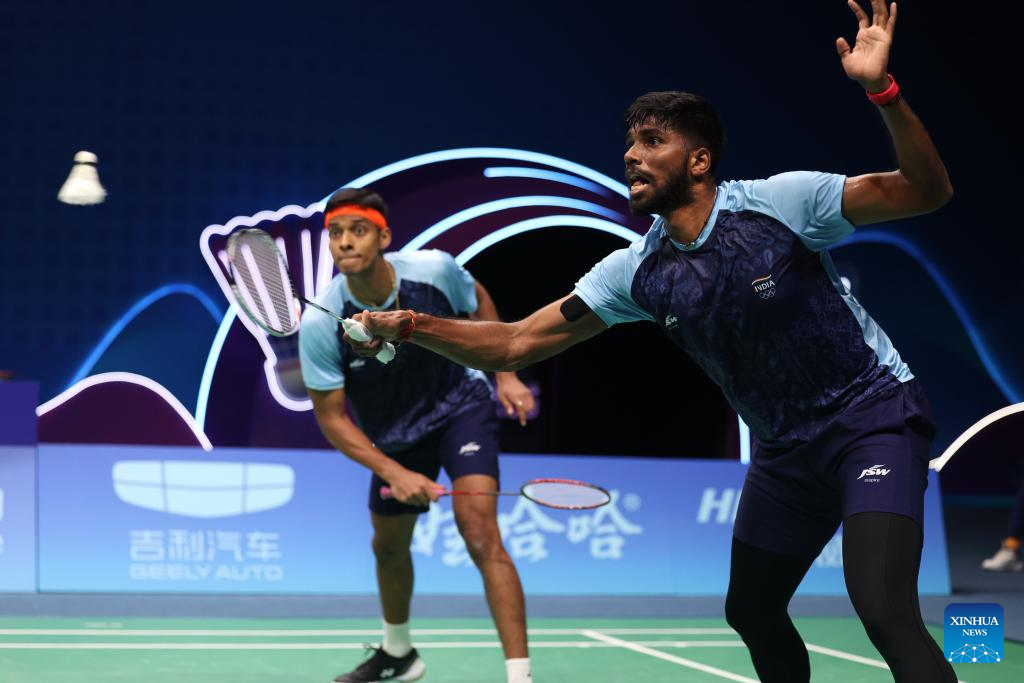 Satwik Sairaj Rankireddy (R) /Chirag Chandrashekhar Shetty of India compete during the Men's Doubles Gold Medal Match of Badminton between Choi Solgyu/Kim Wonho of South Korea and Satwik Sairaj Rankireddy/Chirag Chandrashekhar Shetty of India at the 19th Asian Games in Hangzhou, east China's Zhejiang Province, Oct. 7, 2023. (Xinhua/Chen Bin)
