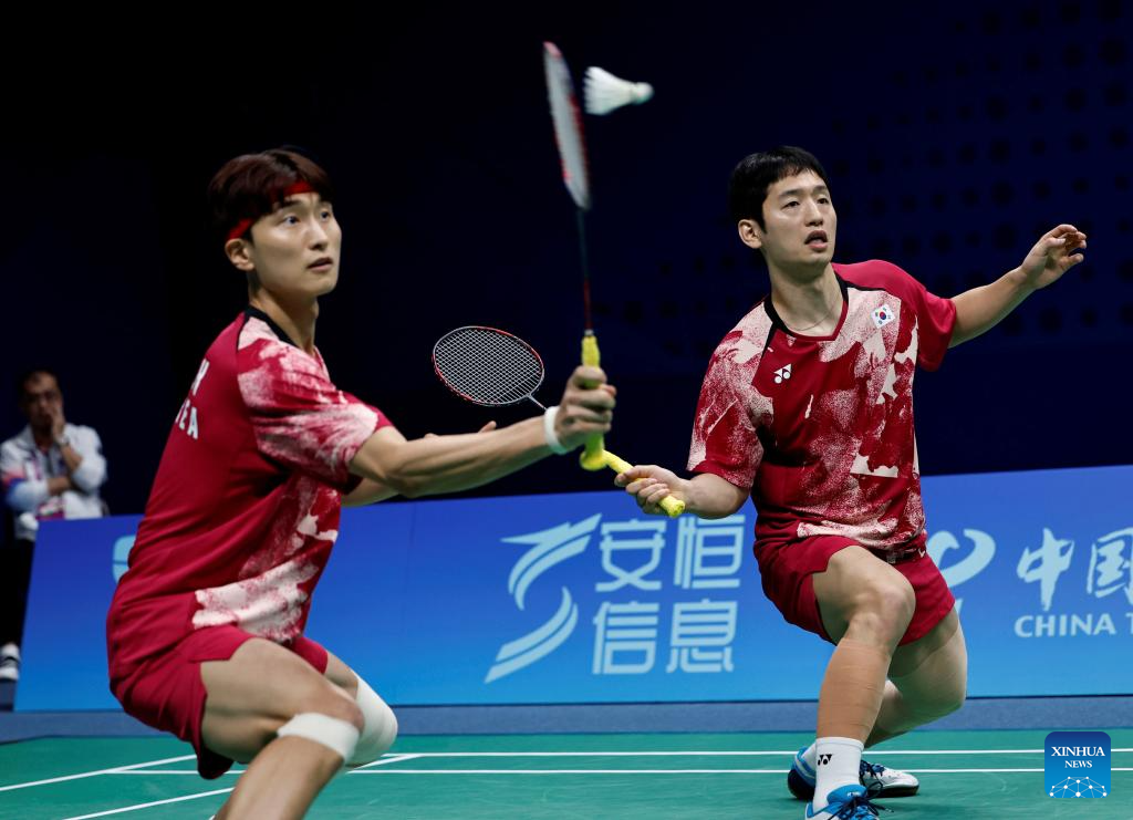 Choi Solgyu (R)/Kim Wonho of South Korea compete during the Men's Doubles Gold Medal Match of Badminton between Choi Solgyu/Kim Wonho of South Korea and Satwik Sairaj Rankireddy/Chirag Chandrashekhar Shetty of India at the 19th Asian Games in Hangzhou, east China's Zhejiang Province, Oct. 7, 2023. (Xinhua/Ren Zhenglai)