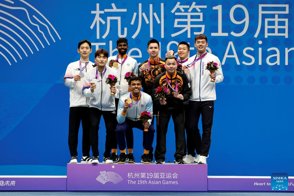 Medalists attend the awarding ceremony for the Men's Doubles of Badminton at the 19th Asian Games in Hangzhou, east China's Zhejiang Province, Oct. 7, 2023. (Xinhua/Ren Zhenglai)