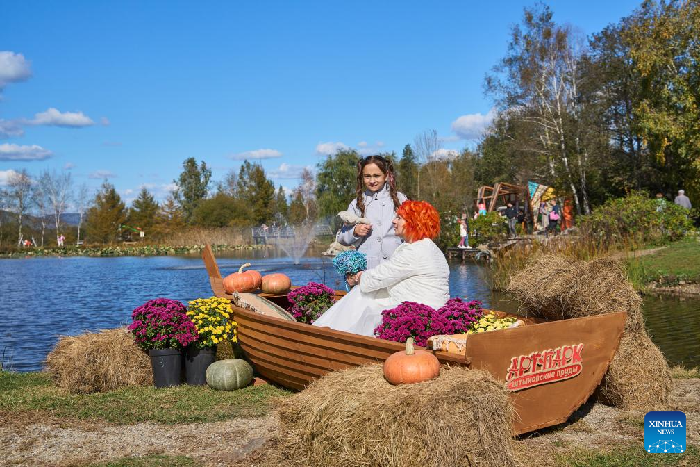 A tourist sits in a boat at the pumpkin festival in Vladivostok, Russia, Oct. 7, 2023. A pumpkin festival was held on the outskirts of Vladivostok on Saturday to celebrate the harvest season. (Photo by Guo Feizhou/Xinhua)