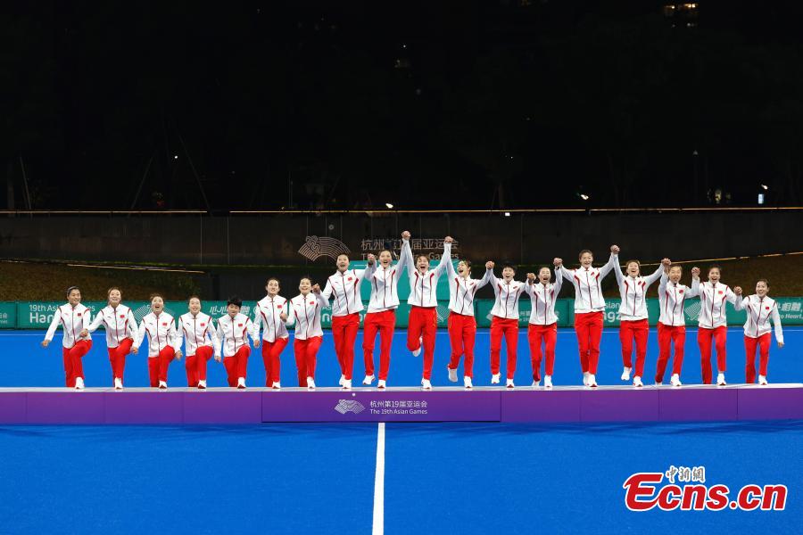 Team members of Chinese women's hockey attend the awarding ceremony after winning the women's hockey gold medal at the 19th Asian Games at Gongshu Canal Sports Park Stadium in Hangzhou, east China's Zhejiang Province, Oct. 7, 2023. (Photo: China News Service/Fu Tian)