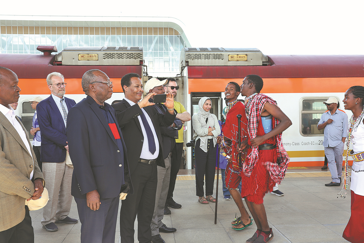 Foreign diplomats from various countries in Kenya enjoy a dance show by the Maasai people at the Nairobi Terminus of the Mombasa-Nairobi Railway in Nairobi, Kenya, on Friday. WU XIAOHUI/CHINA DAILY