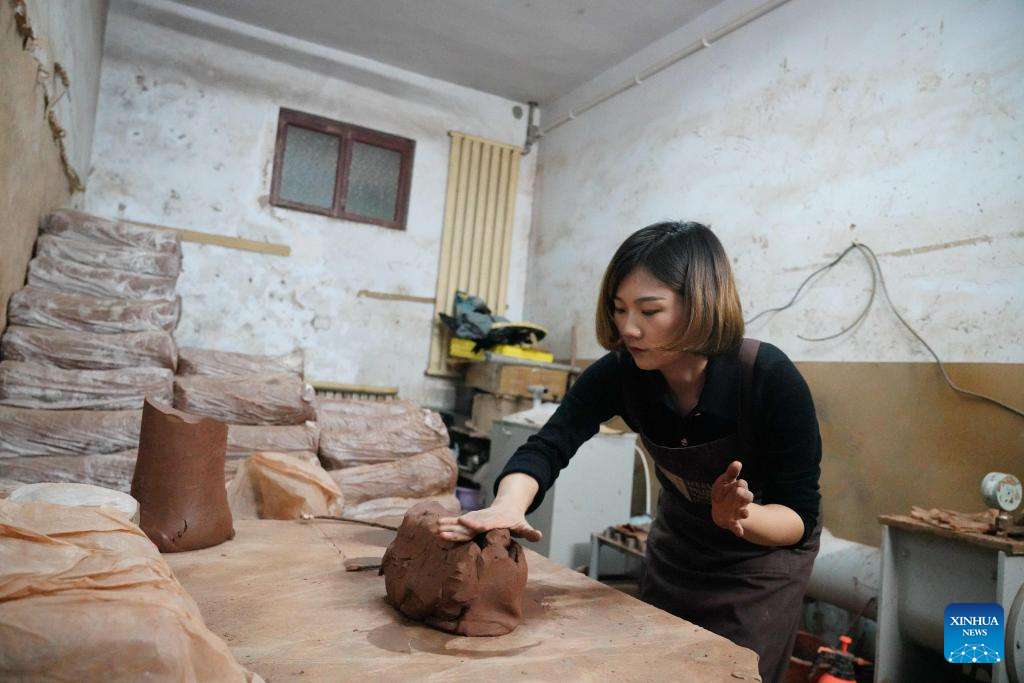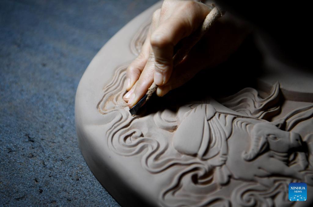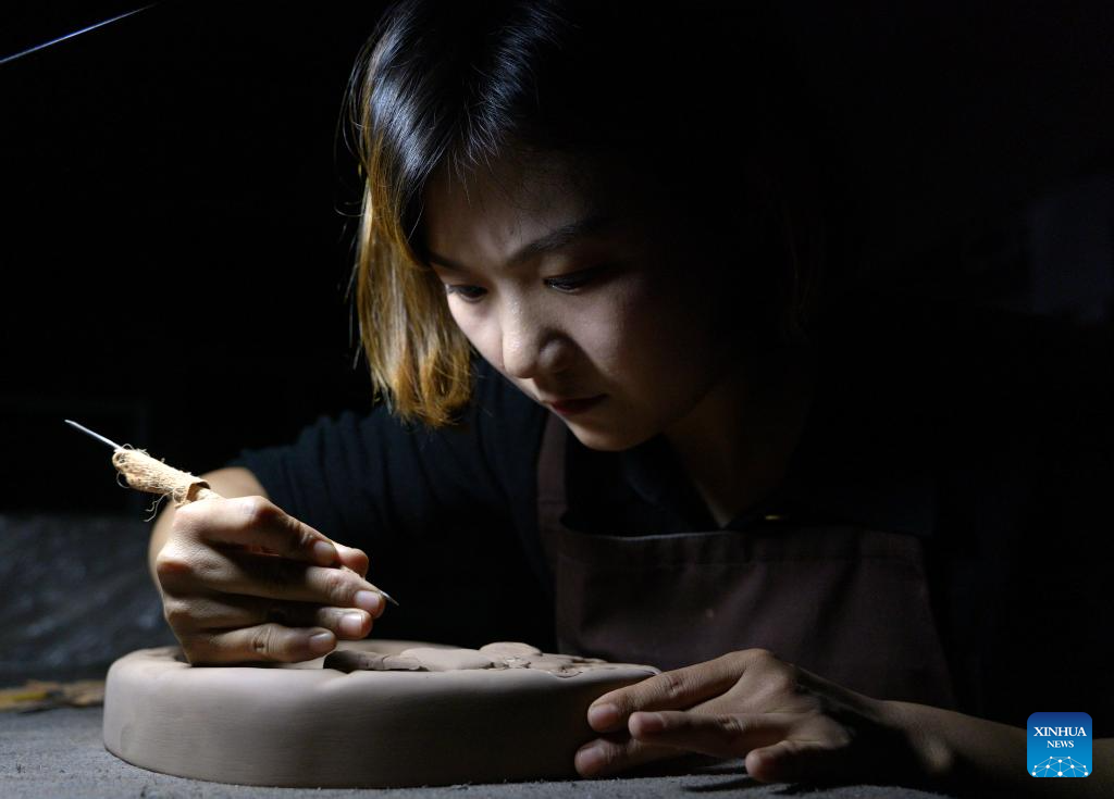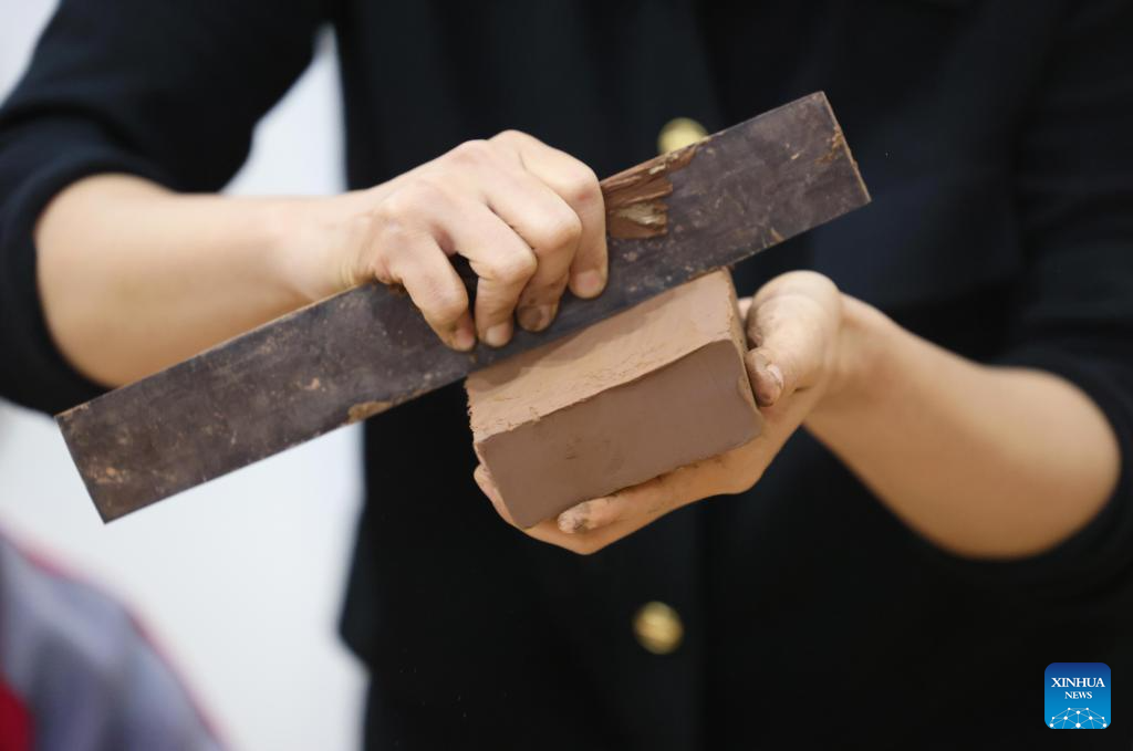 You Xiaoxiao shows how to cut the mud at a Chengni inkstone art museum in Xin'an County, central China's Henan Province, Oct. 7, 2023. (Xinhua/Xing Guangli)