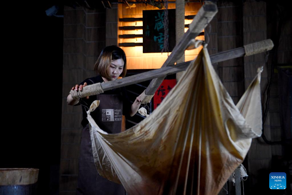You Xiaoxiao kneads the mud in Xin'an County, central China's Henan Province, Oct. 7, 2023. (Xinhua/Xing Guangli)