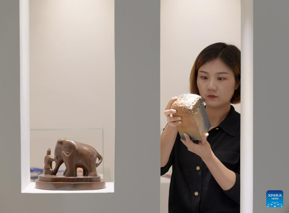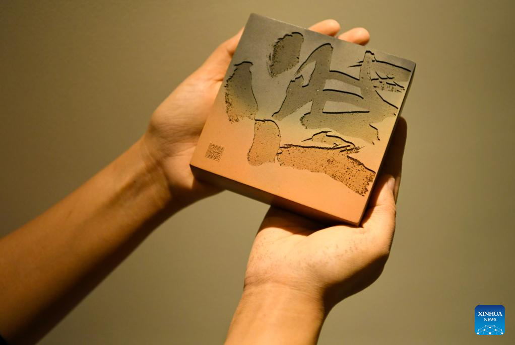 You Xiaoxiao shows a Chengni inkstone at a Chengni inkstone art museum in Xin'an County, central China's Henan Province, Oct. 7, 2023. (Xinhua/Hao Yuan)