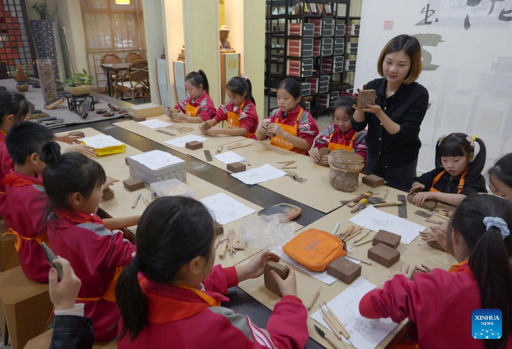 You Xiaoxiao teaches students to make Chengni inkstone at a Chengni inkstone art museum in Xin'an County, central China's Henan Province, Oct. 7, 2023. (Xinhua/Hao Yuan)