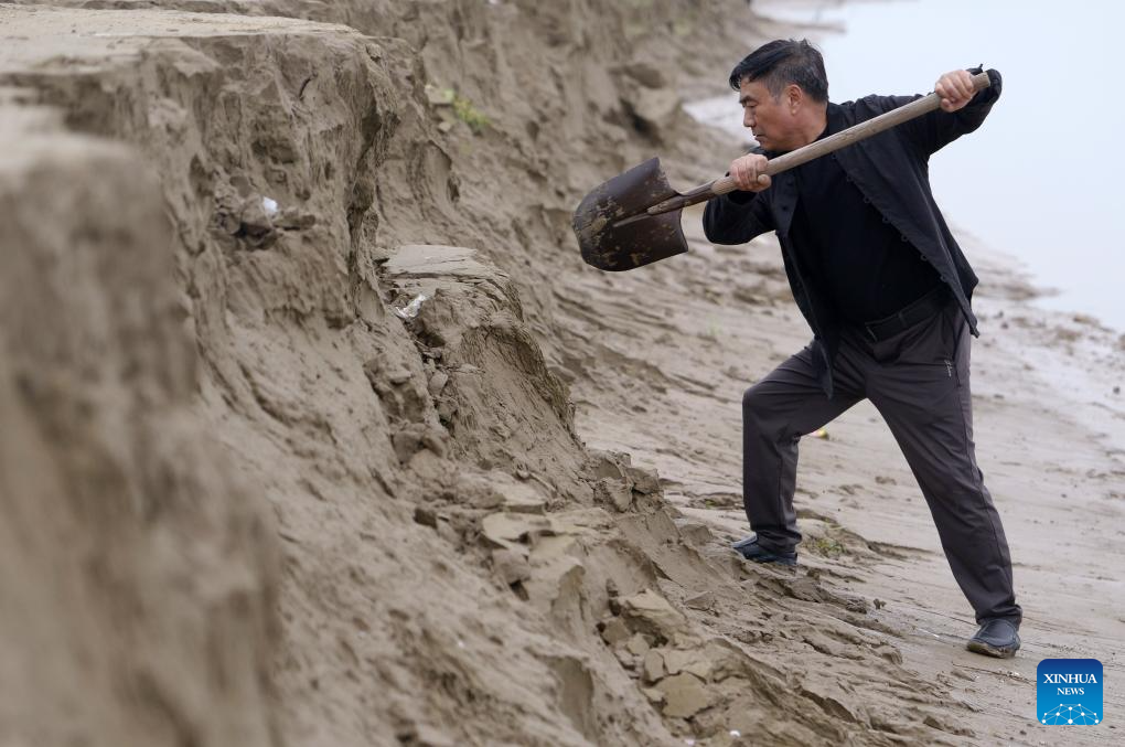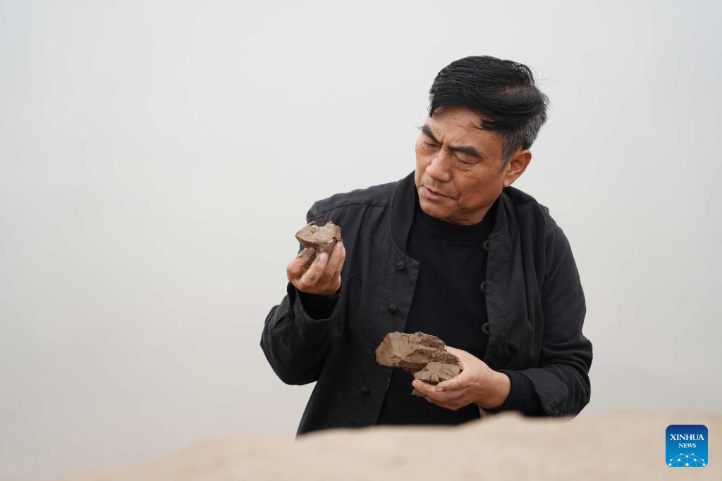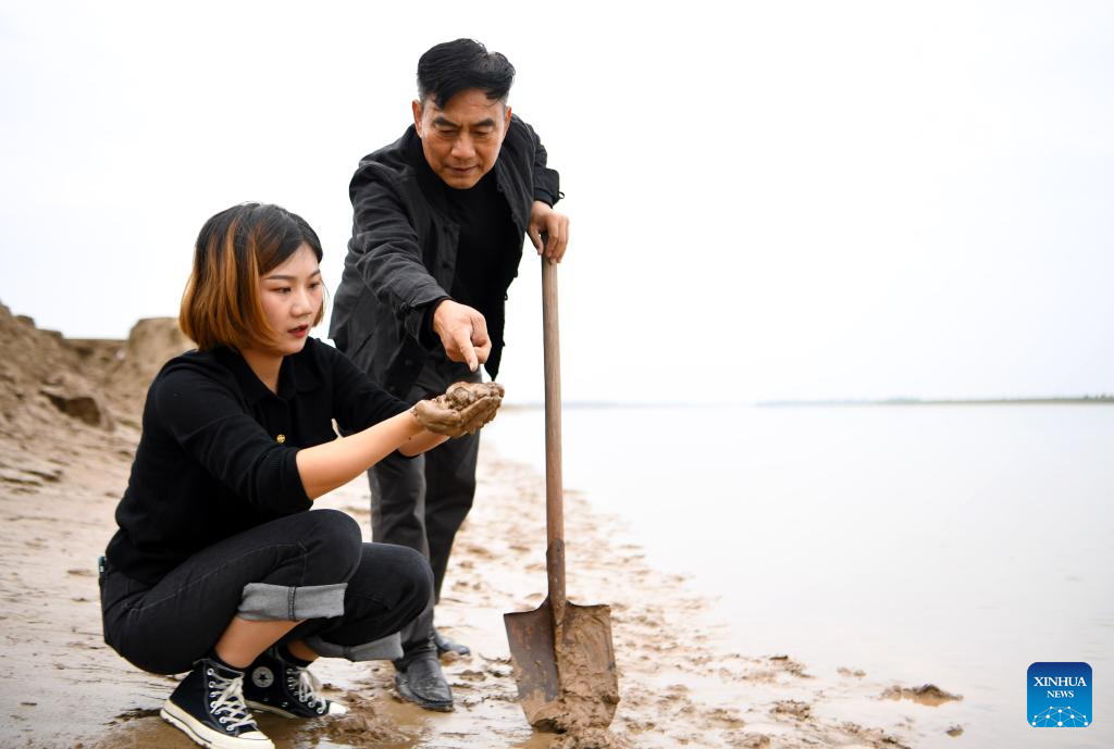 You Min, father of You Xiaoxiao, checks the mud at the Luoyang section of Yellow River, central China's Henan Province, Oct. 7, 2023. (Xinhua/Wang Jingyi)