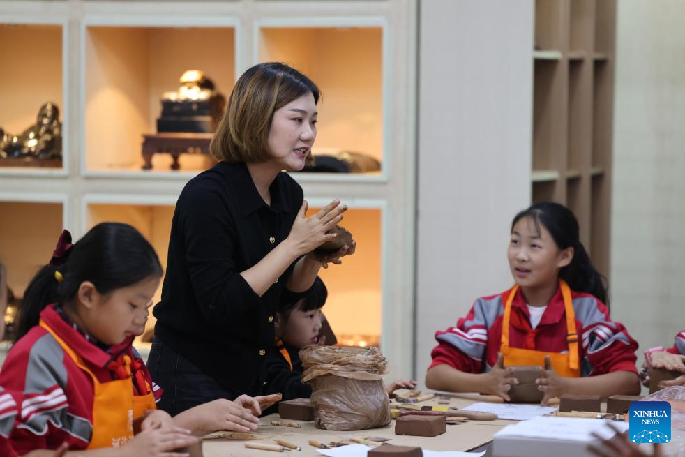 You Xiaoxiao teaches students to shape the mud at a Chengni inkstone art museum in Xin'an County, central China's Henan Province, Oct. 7, 2023. (Xinhua/Xing Guangli)