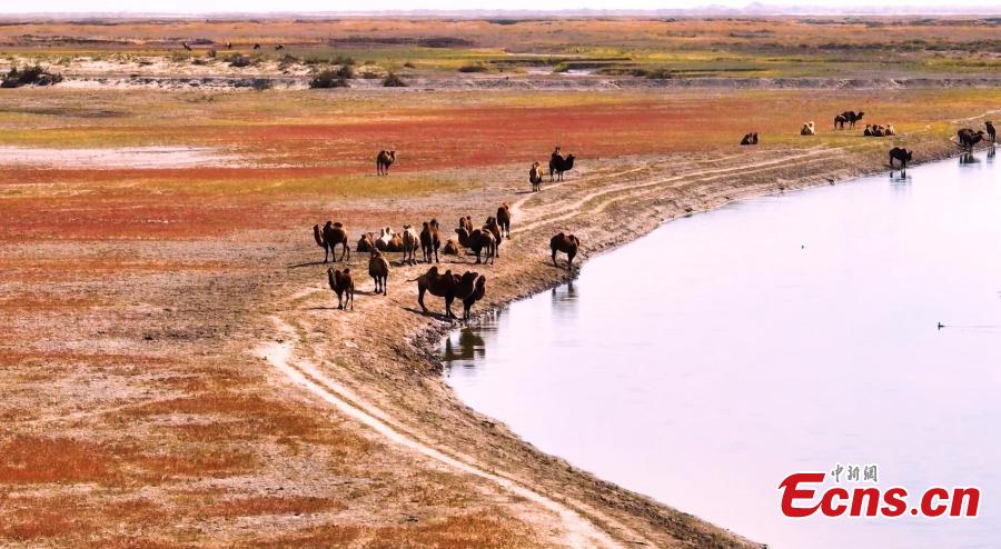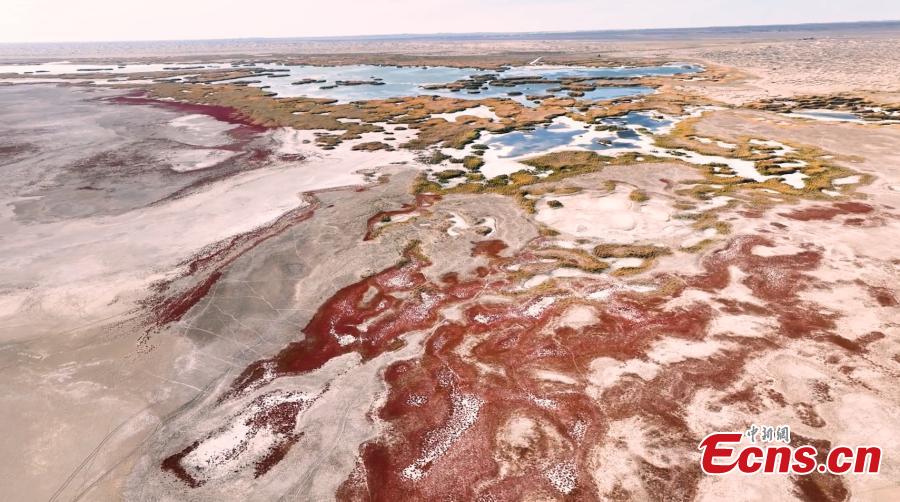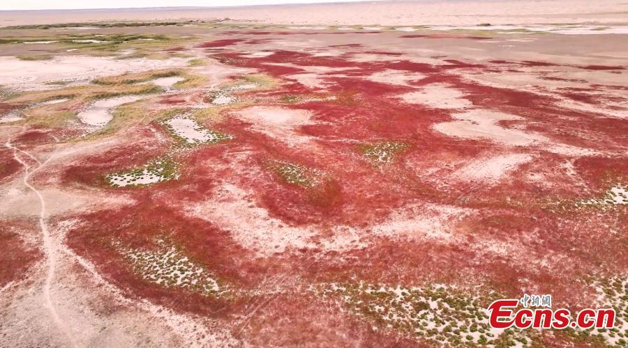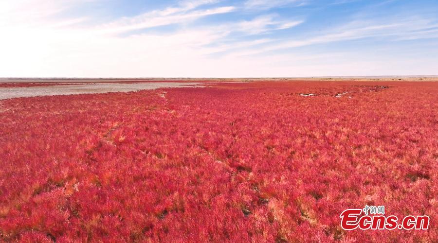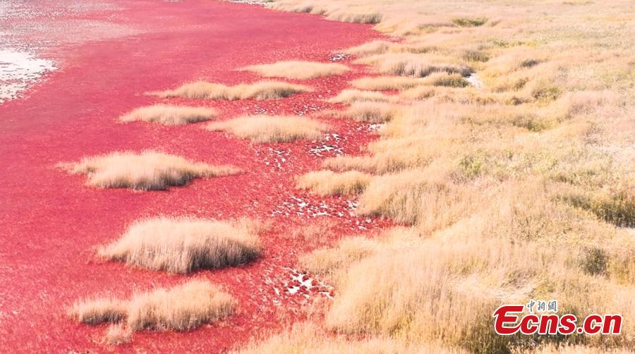 A vast expanse of a red plant, known as seepweed, turns the wetland rosy red as autumn arrived at Juyanhai Lake in Ejin Banner of Alxa League, north China's Inner Mongolia Autonomous Region. (Photo/China News Service)
