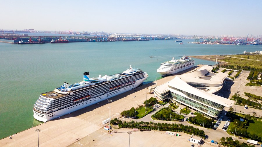 This aerial photo taken on Sept. 22, 2023 shows the cruise ships "Mediterranea" and "Dream" docked at a port in north China's Tianjin Municipality. (Xinhua)