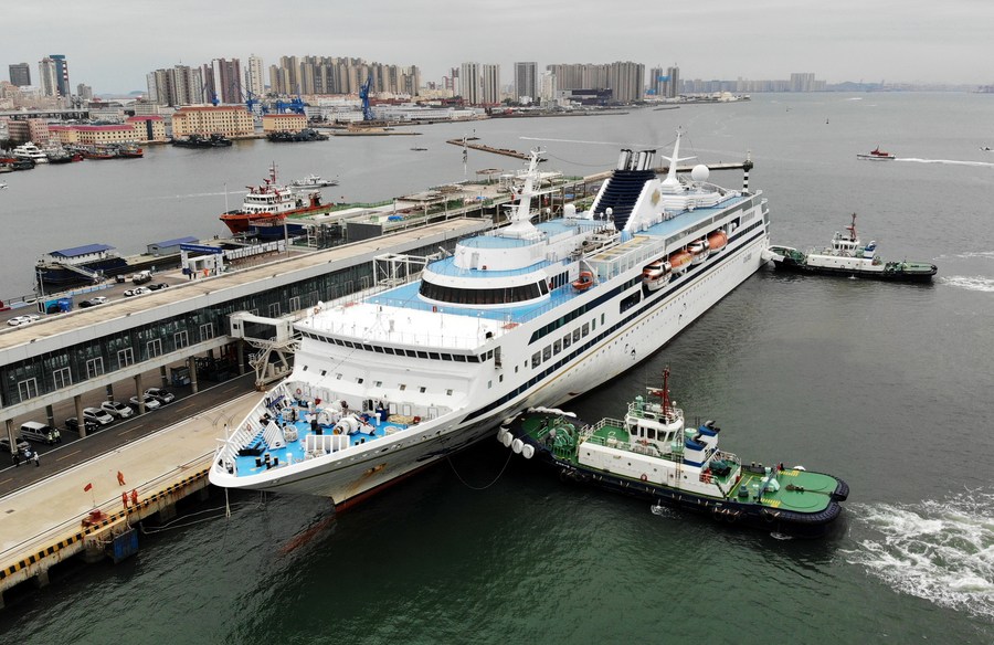 Cruise ship "Blue Dream Star" is pictured at a port in Qingdao, east China's Shandong Province, before setting sail for the Republic of Korea with nearly 1,000 tourists, in this aerial photo taken on Sept. 29, 2023. (Xinhua/Li Ziheng)