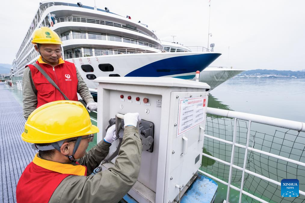 Shore power maintenance staff members with the State Grid Yichang Power Supply Company works at Zigui port in Yichang City, central China's Hubei Province, Oct. 9, 2023. Since 2015, Yichang has been active in constructing shore power facilities. To date, 168 sets of shore power facilities with a capacity of 27,000 kilovolt-amperes have been installed, covering 67 docks on the Yichang section of the Yangtze River. (Xinhua/Xiao Yijiu)