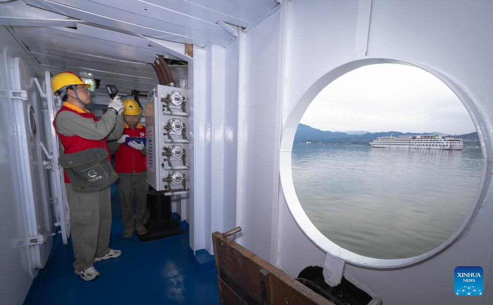 Shore power maintenance staff members with the State Grid Yichang Power Supply Company inspect shore power facilities on a boat at Zigui port in Yichang City, central China's Hubei Province, Oct. 9, 2023. Since 2015, Yichang has been active in constructing shore power facilities. To date, 168 sets of shore power facilities with a capacity of 27,000 kilovolt-amperes have been installed, covering 67 docks on the Yichang section of the Yangtze River. (Xinhua/Xiao Yijiu)