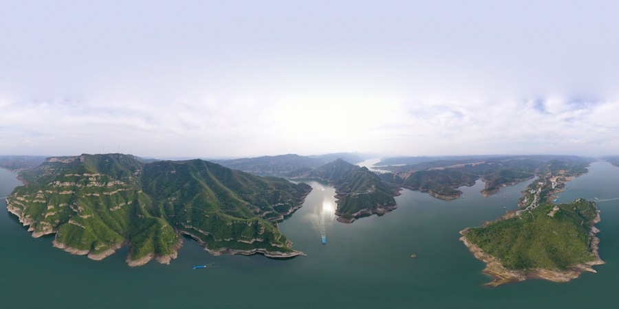 This aerial panoramic photo taken on Oct. 8, 2023 shows the scenery of a canyon located upstream of Xiaolangdi water conservancy project on the Yellow River in Jiyuan City, central China's Henan Province. (Xinhua/Hao Yuan)