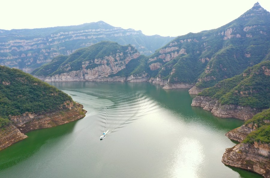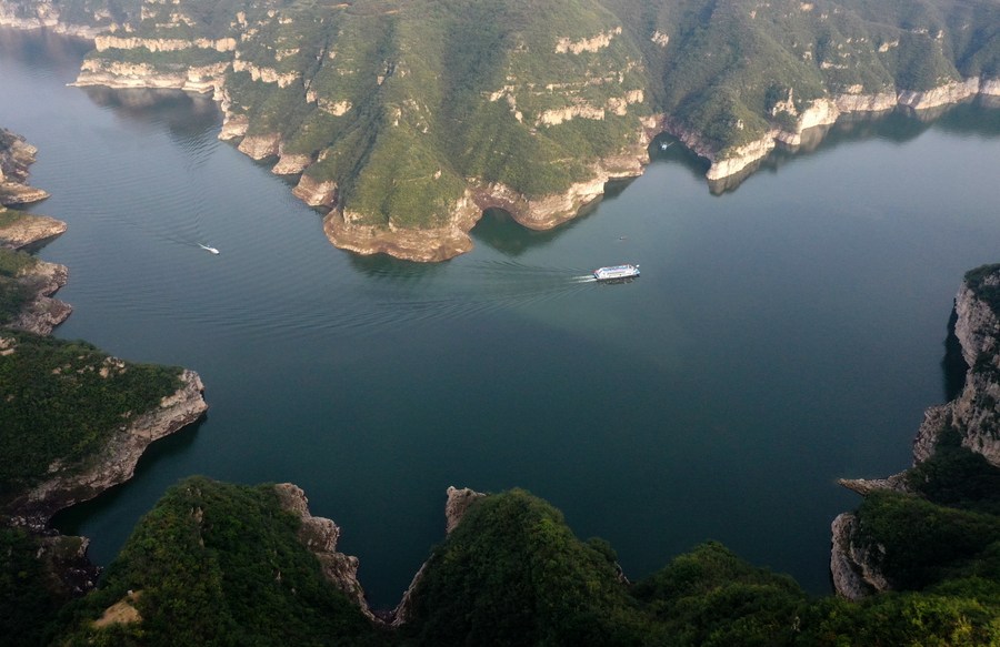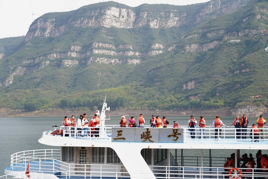 Tourists enjoy the scenery of a canyon located upstream of Xiaolangdi water conservancy project on the Yellow River in Jiyuan City, central China's Henan Province, Oct. 8, 2023. (Xinhua/Wang Jingyi)