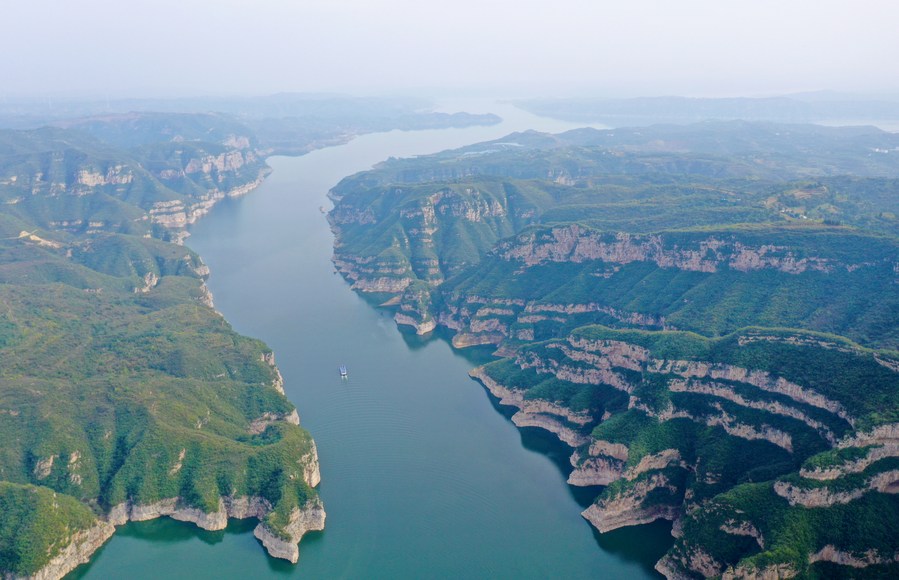 This aerial photo taken on Oct. 8, 2023 shows the scenery of a canyon located upstream of Xiaolangdi water conservancy project on the Yellow River in Jiyuan City, central China's Henan Province. (Xinhua/Xing Guangli)