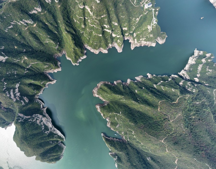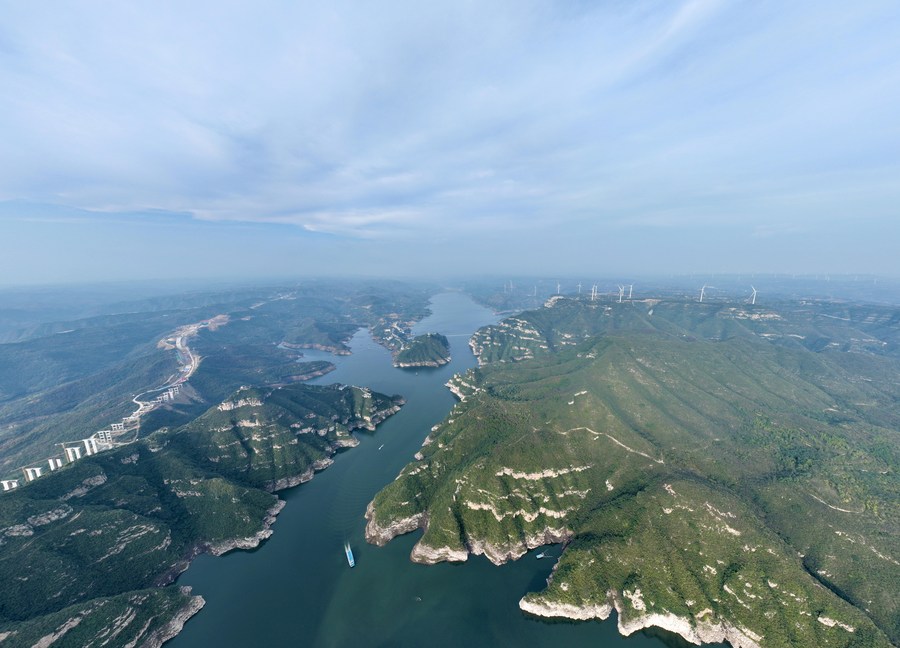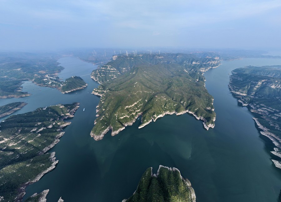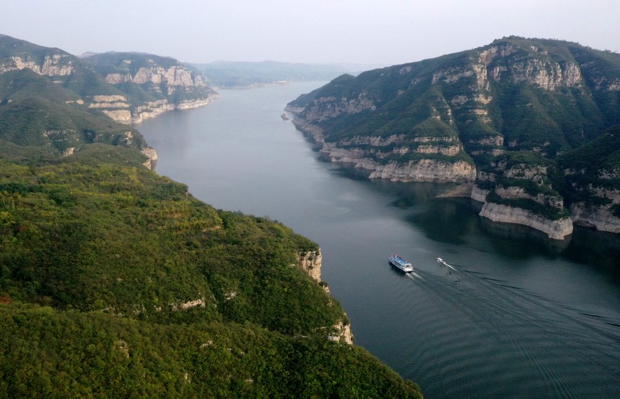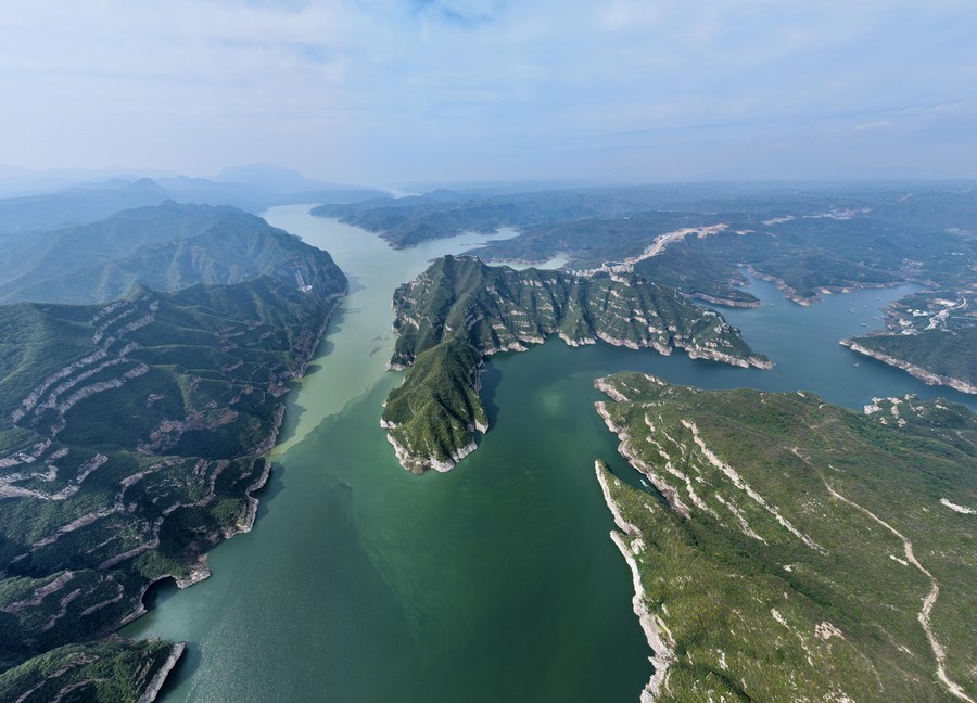 This aerial photo taken on Oct. 8, 2023 shows the scenery of a canyon located upstream of Xiaolangdi water conservancy project on the Yellow River in Jiyuan City, central China's Henan Province. (Xinhua/Hao Yuan)