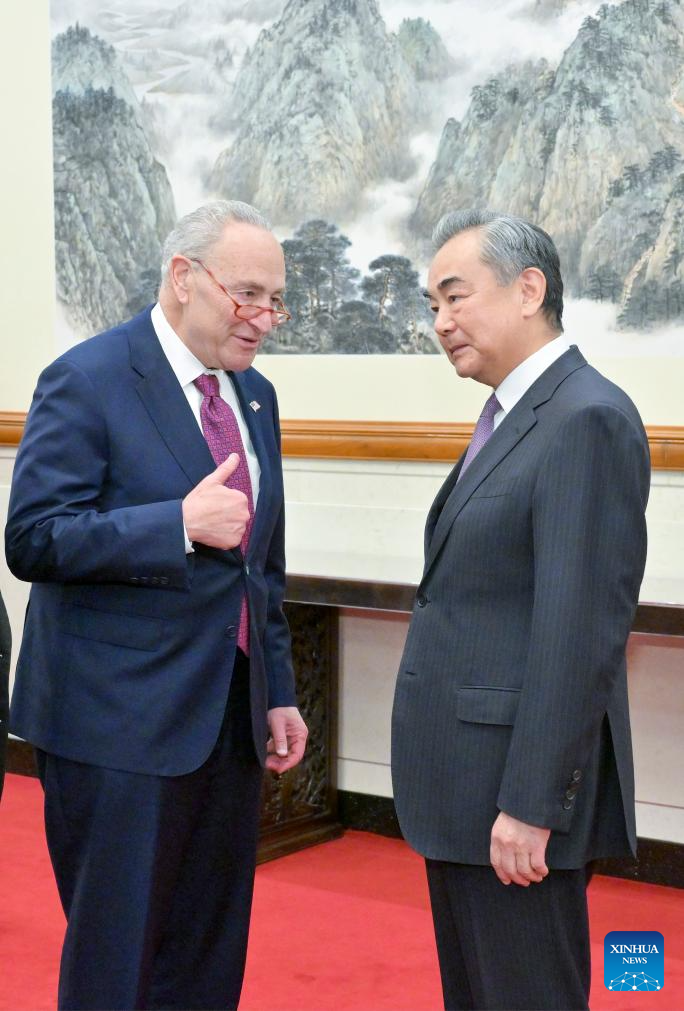 BEIJING, Oct. 9 (Xinhua) -- Chinese Foreign Minister Wang Yi met with a U.S. congressional delegation led by Senate Majority Leader Chuck Schumer in Beijing on Monday.