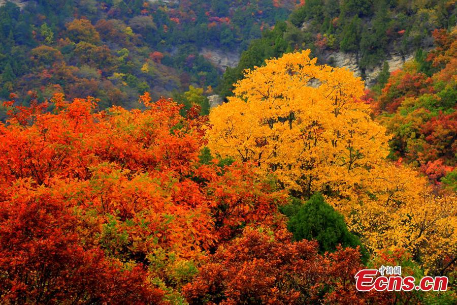 Renzu Mountain presents a breathtaking landscape as autumn leaves turn red in Ji County of Linfen, north China's Shanxi Province. (Photo: China News Service/Yan Pengfei)