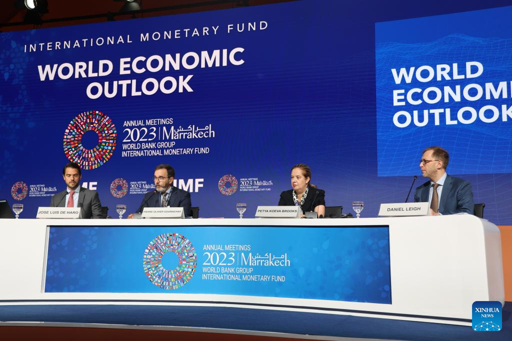 This photo taken on Oct. 10, 2023 shows the press conference on the International Monetary Fund (IMF) release of the World Economic Outlook report in Marrakesh, Morocco. The IMF predicted that global economic growth to slow from 3.5 percent in 2022 to 3.0 percent in 2023 and 2.9 percent in 2024. (Xinhua/Huo Jing)