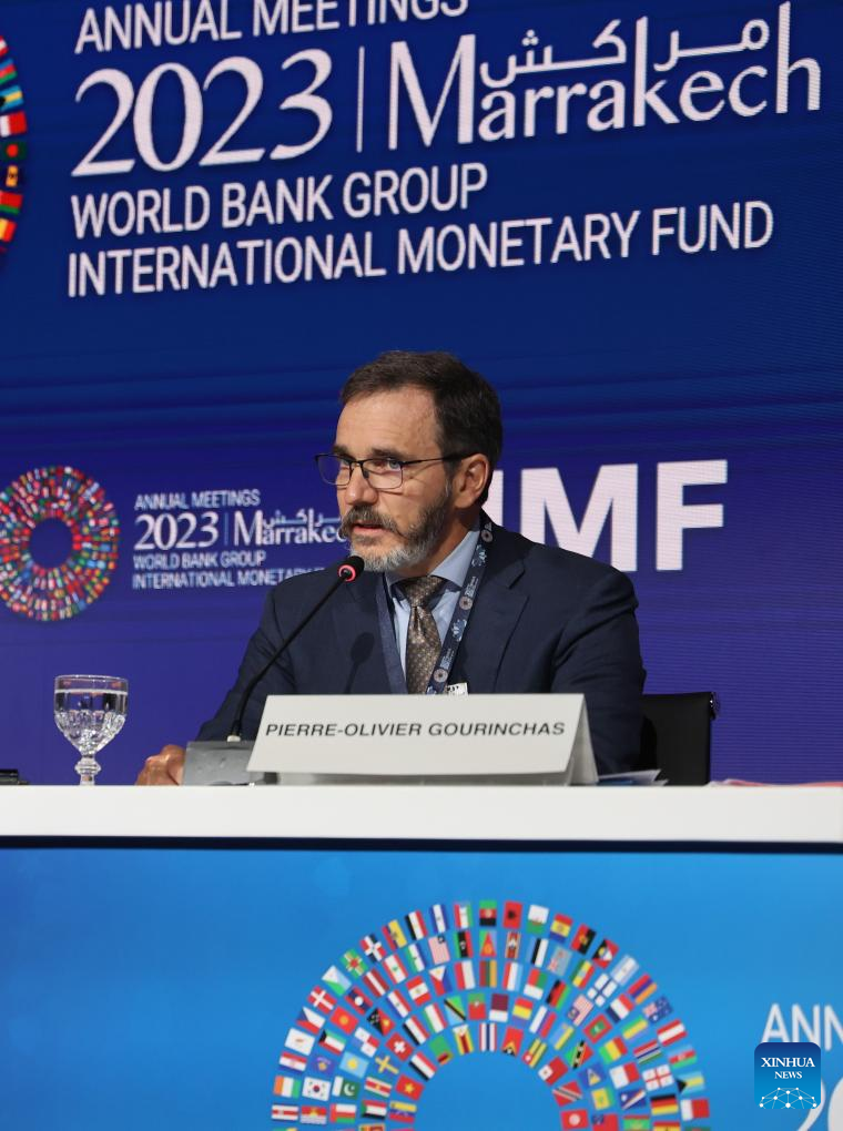 International Monetary Fund (IMF) chief economist Pierre-Olivier Gourinchas speaks at the press conference on the IMF release of the World Economic Outlook report in Marrakesh, Morocco, Oct. 10, 2023. The IMF predicted that global economic growth to slow from 3.5 percent in 2022 to 3.0 percent in 2023 and 2.9 percent in 2024. (Xinhua/Huo Jing)