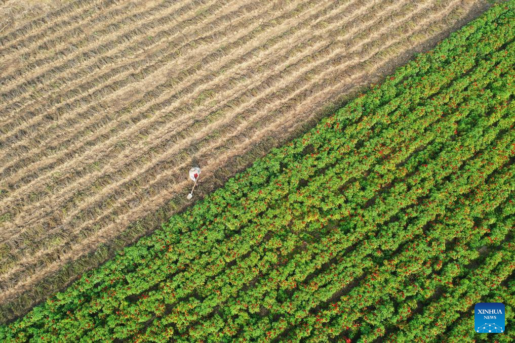 This aerial photo taken on Oct. 10, 2023 shows a farmer harvesting peanuts in Lizhuang Township, Baofeng County, central China's Henan Province. (Photo by He Wuchang/Xinhua)