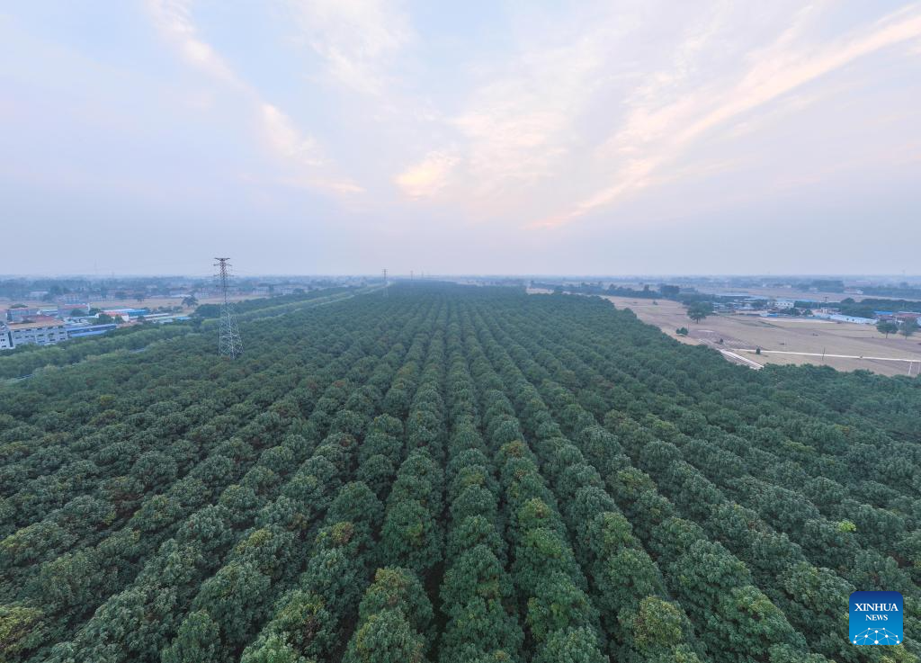 This aerial photo taken on Oct. 9, 2023 shows the paulownia trees at Lankao County of Kaifeng City, central China's Henan Province. (Xinhua/Xing Guangli)