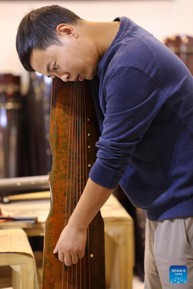Guqin maker Xu Yachong tunes the Guqin at Lankao County of Kaifeng City, central China's Henan Province, Oct. 9, 2023. (Xinhua/Xing Guangli)