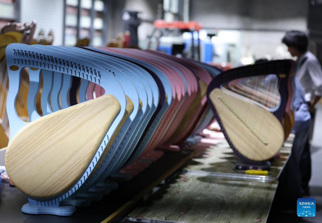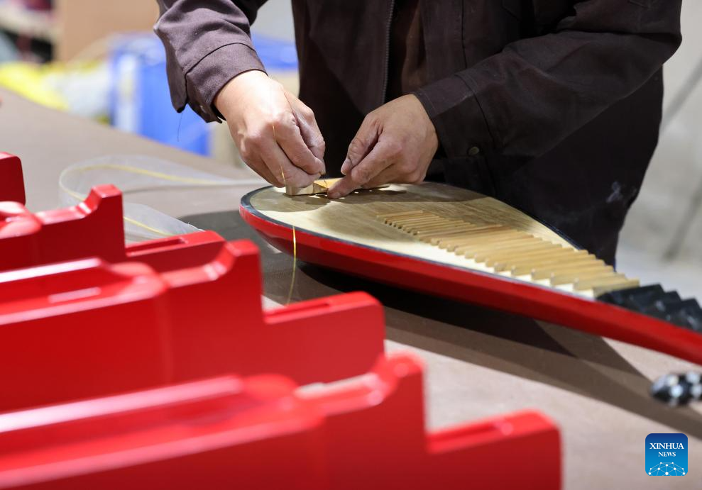 A staff member tunes a musical instrument at a musical instrument factory in Lankao County of Kaifeng City, central China's Henan Province, Oct. 9, 2023. (Xinhua/Xing Guangli)