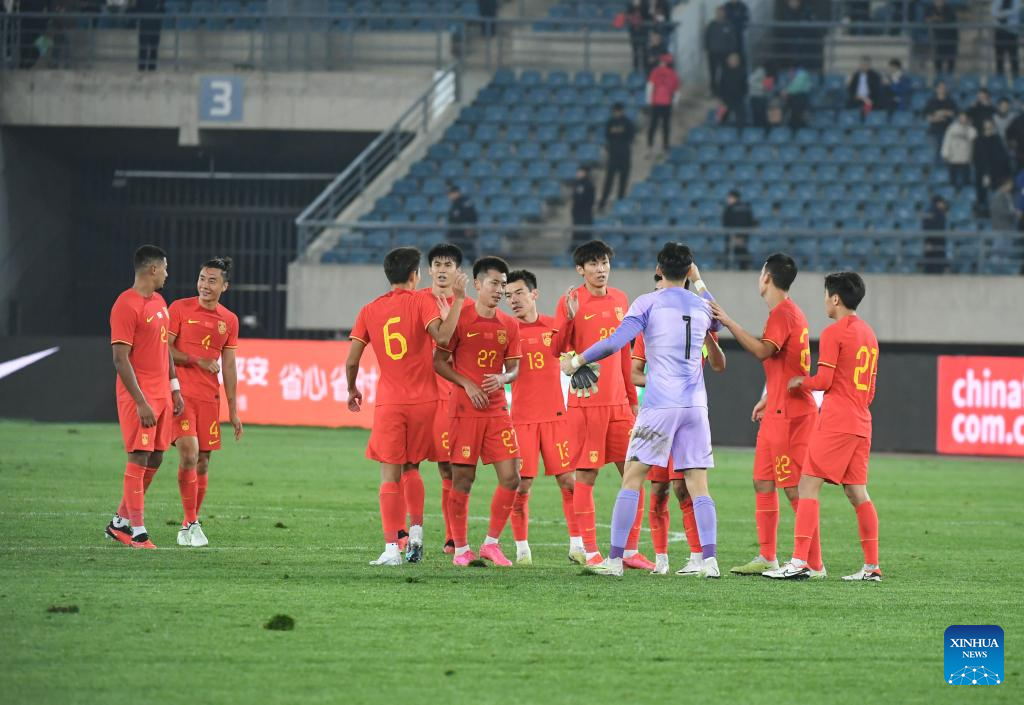 Players of China celebrate winning after an international friendly football match between China and Vietnam in Dalian, northeast China's Liaoning Province, Oct. 10, 2023. (Xinhua/Long Lei)