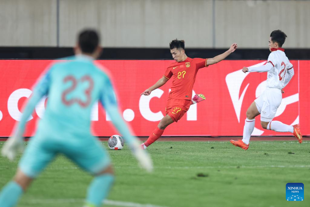 He Yupeng (C) of China passes the ball during an international friendly football match between China and Vietnam in Dalian, northeast China's Liaoning Province, Oct. 10, 2023. (Xinhua/Pan Yulong)