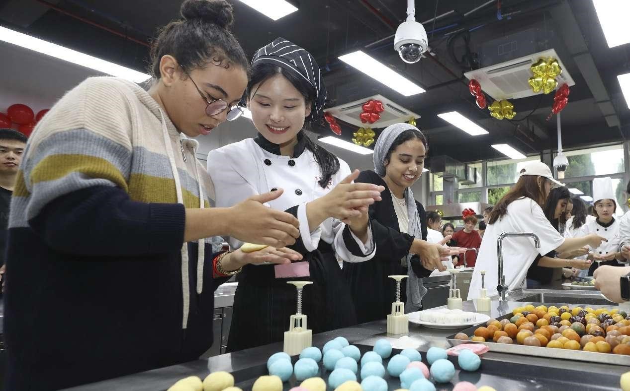Chinese and foreign students make mooncakes in Huai'an, east China's Jiangsu province, Sept. 27, 2023. (People's Daily Online/Zhao Qirui)
